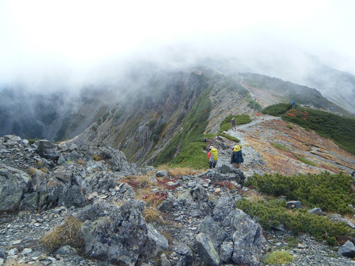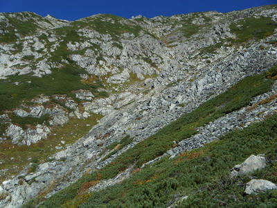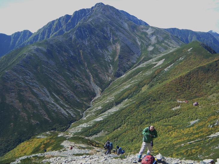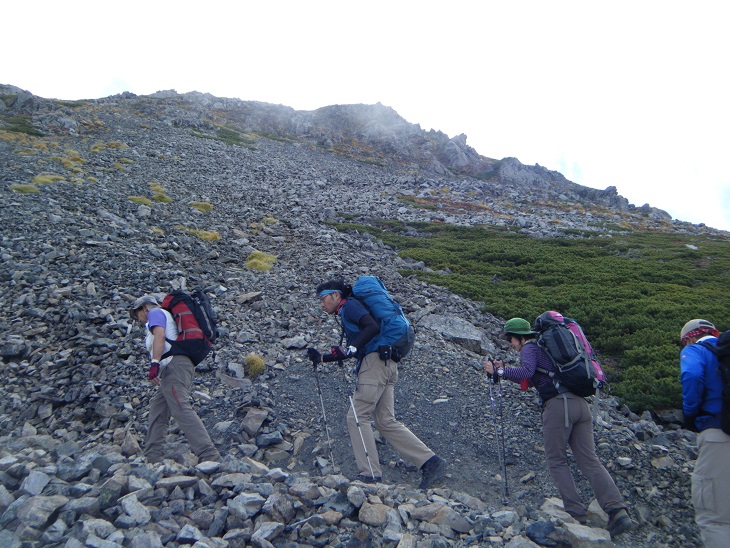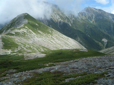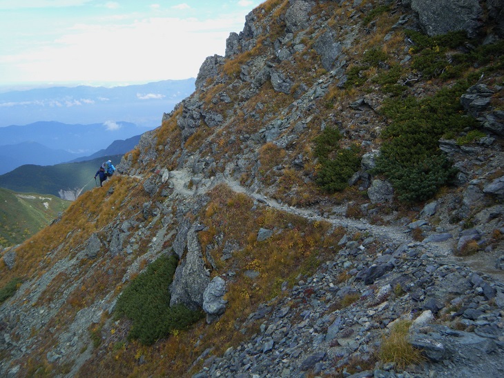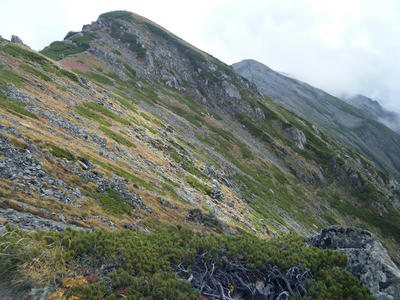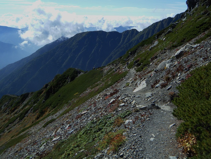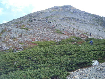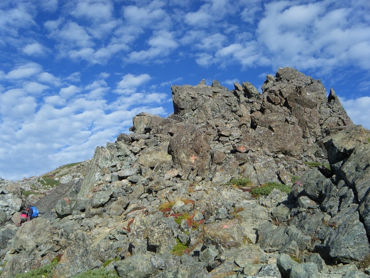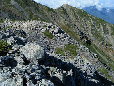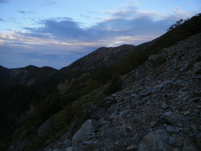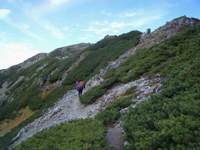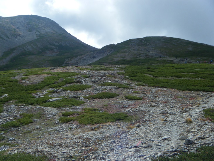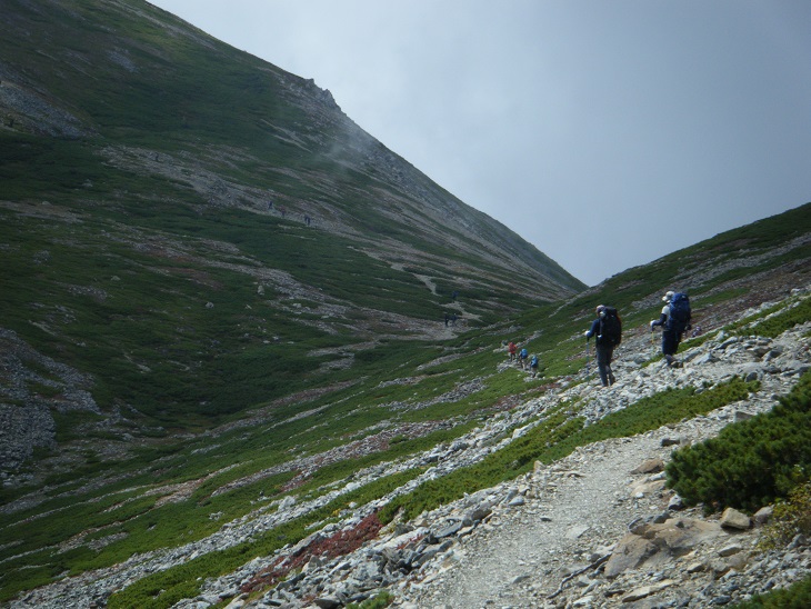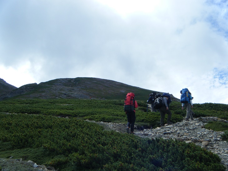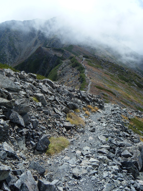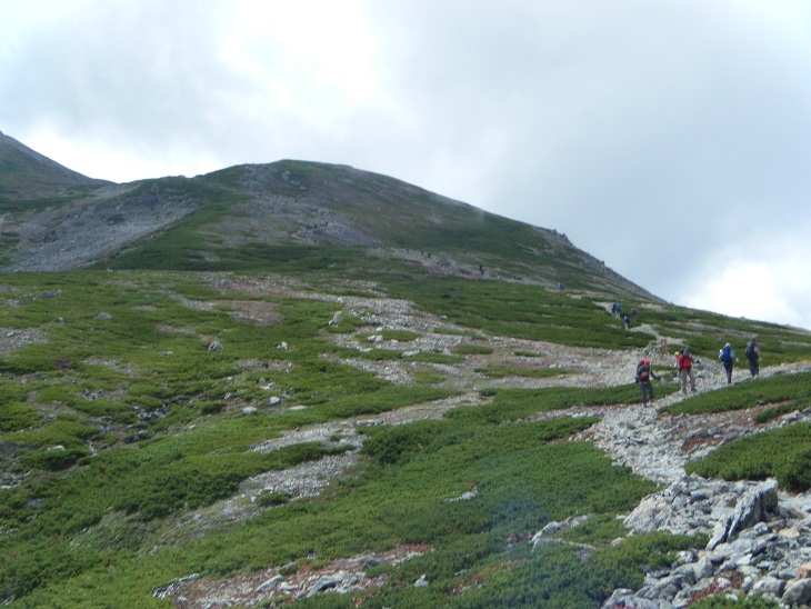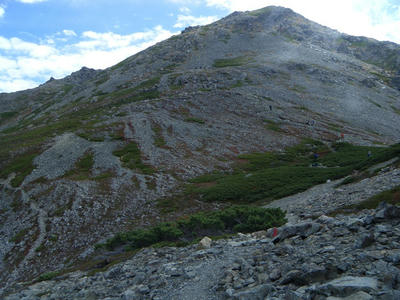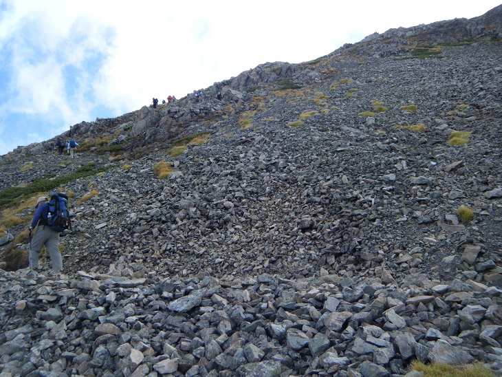 8時14分、今宵の宿泊地である千枚小屋に向け出発。今回の山行では不安材料が二つある。それは地図上に書かれている2か所の「危」マーク。千枚岳を越えたところにある「岩場のやせ尾根」と書かれたところと悪沢岳を越えたところにある「ガレた急坂」と書かれたところである。NHKの「にっぽん百名山」の悪沢岳の回も見たんだが「岩場のやせ尾根」の方はその手前の岩が非常に気になる。もともとは普通の登山道だったんだが崩壊が進み現在ではスパッと切れているのである。岩場嫌いの僕としてはそこが一番気がかりなのである。もう一つの方の「岩場のやせ尾根」の方はどうなっているのかわからん。まぁ「危」マークが付くくらいだから普通の道ではないのだろう。どちらも非常に気がかりだがそこをクリアしないと悪沢岳と赤石岳には登れない。嫌でもなんでも行かにゃならんのである。
