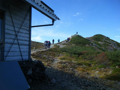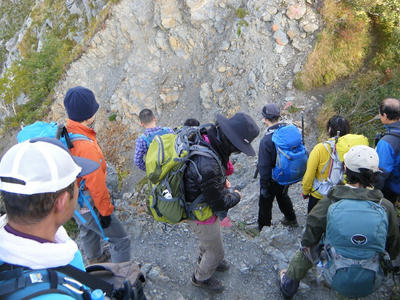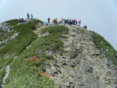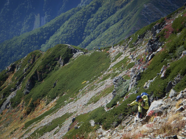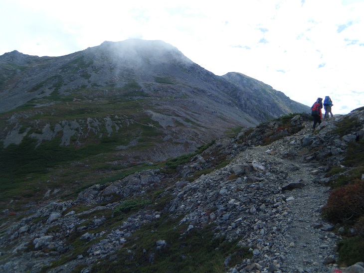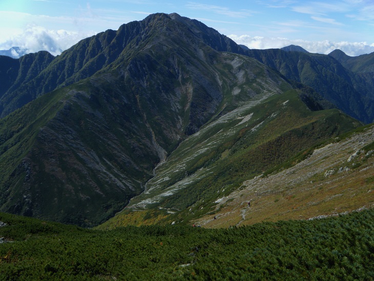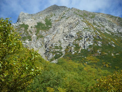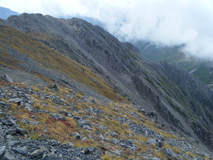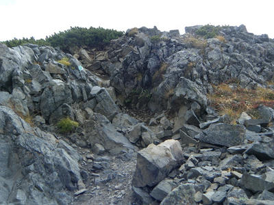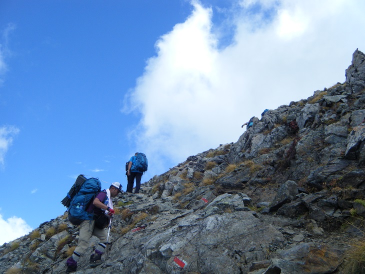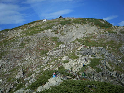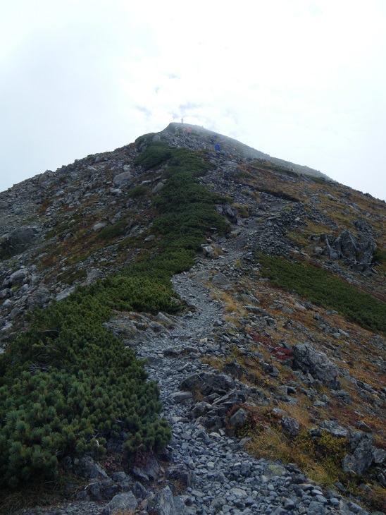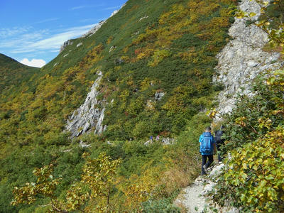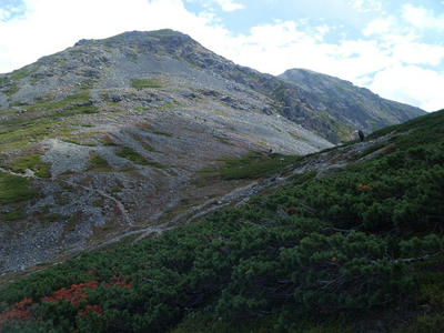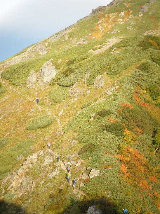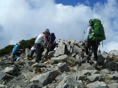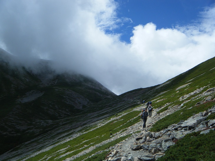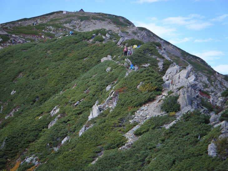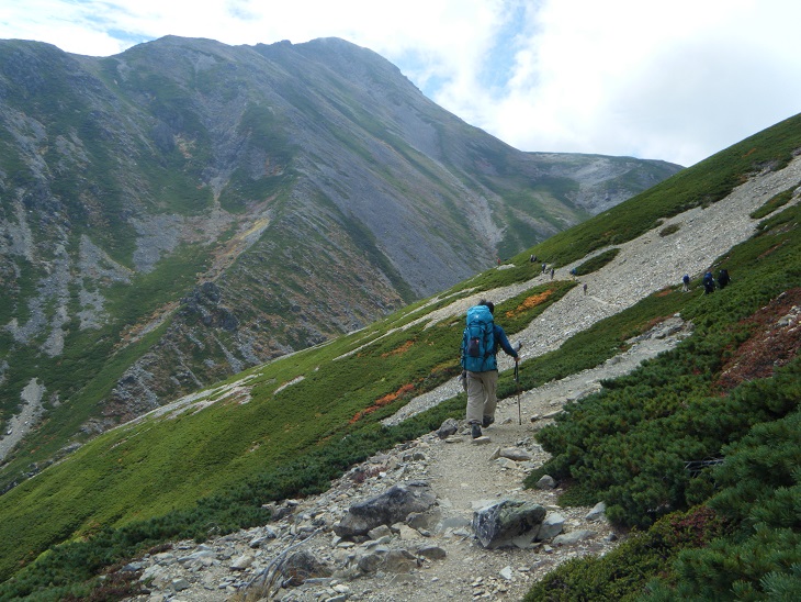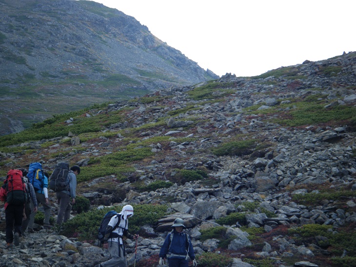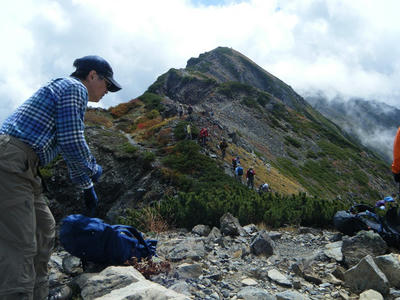 8時14分、今宵の宿泊地である千枚小屋に向け出発。今回の山行では不安材料が二つある。それは地図上に書かれている2か所の「危」マーク。千枚岳を越えたところにある「岩場のやせ尾根」と書かれたところと悪沢岳を越えたところにある「ガレた急坂」と書かれたところである。NHKの「にっぽん百名山」の悪沢岳の回も見たんだが「岩場のやせ尾根」の方はその手前の岩が非常に気になる。もともとは普通の登山道だったんだが崩壊が進み現在ではスパッと切れているのである。岩場嫌いの僕としてはそこが一番気がかりなのである。もう一つの方の「岩場のやせ尾根」の方はどうなっているのかわからん。まぁ「危」マークが付くくらいだから普通の道ではないのだろう。どちらも非常に気がかりだがそこをクリアしないと悪沢岳と赤石岳には登れない。嫌でもなんでも行かにゃならんのである。