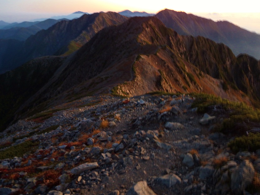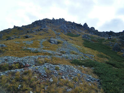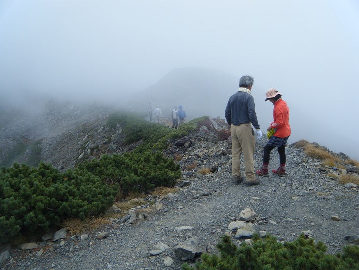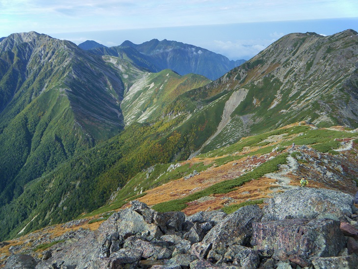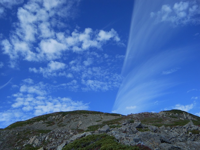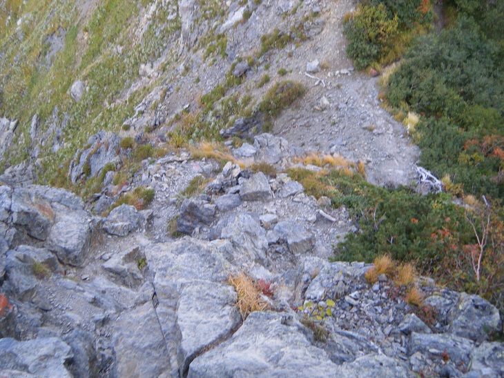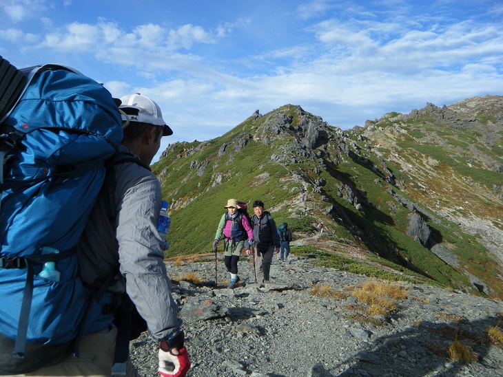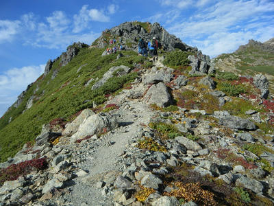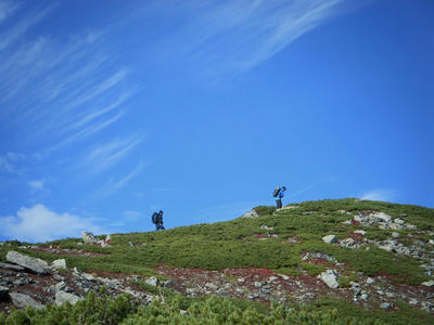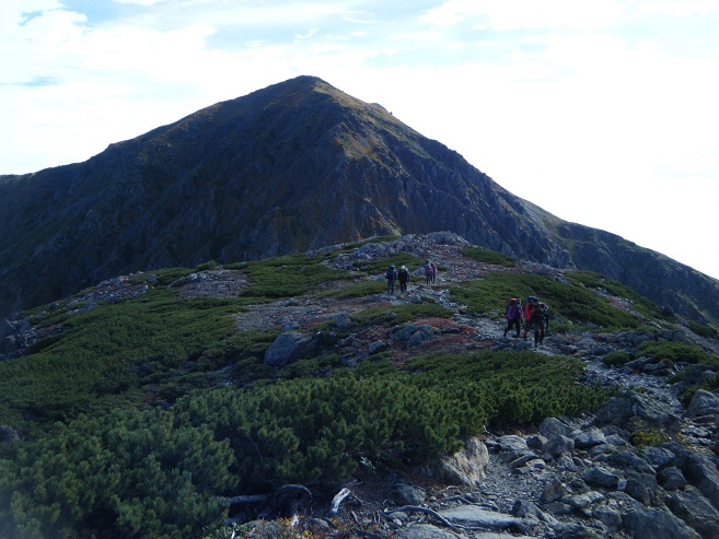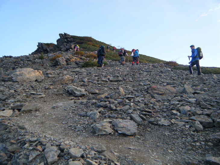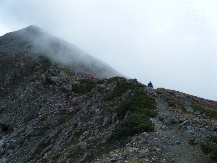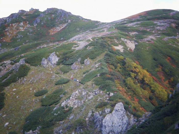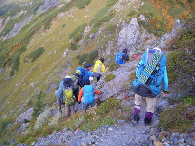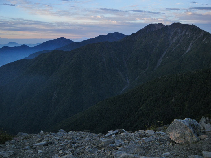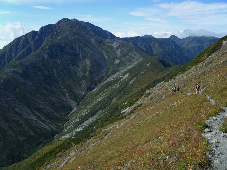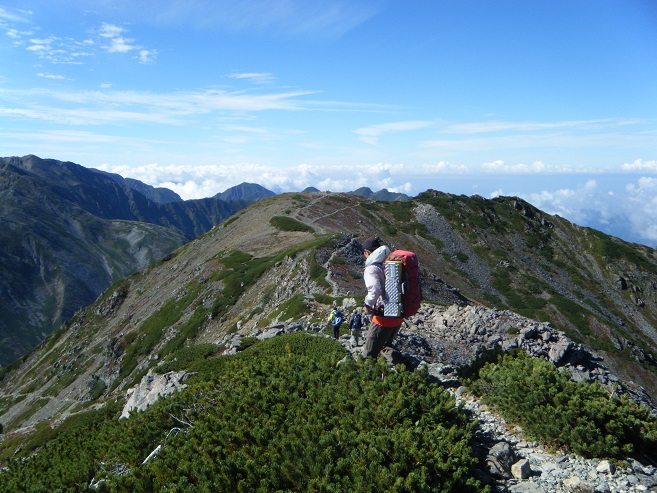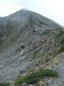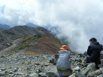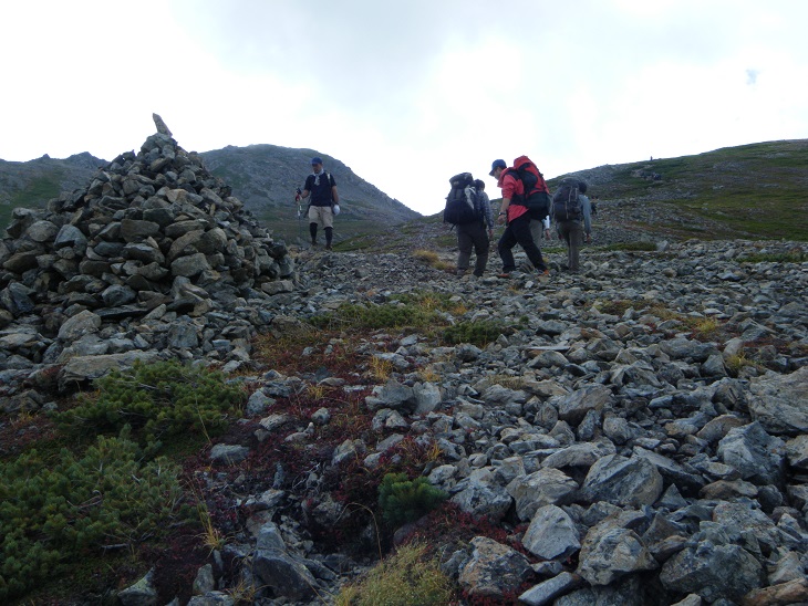 8時14分、今宵の宿泊地である千枚小屋に向け出発。今回の山行では不安材料が二つある。それは地図上に書かれている2か所の「危」マーク。千枚岳を越えたところにある「岩場のやせ尾根」と書かれたところと悪沢岳を越えたところにある「ガレた急坂」と書かれたところである。NHKの「にっぽん百名山」の悪沢岳の回も見たんだが「岩場のやせ尾根」の方はその手前の岩が非常に気になる。もともとは普通の登山道だったんだが崩壊が進み現在ではスパッと切れているのである。岩場嫌いの僕としてはそこが一番気がかりなのである。もう一つの方の「岩場のやせ尾根」の方はどうなっているのかわからん。まぁ「危」マークが付くくらいだから普通の道ではないのだろう。どちらも非常に気がかりだがそこをクリアしないと悪沢岳と赤石岳には登れない。嫌でもなんでも行かにゃならんのである。