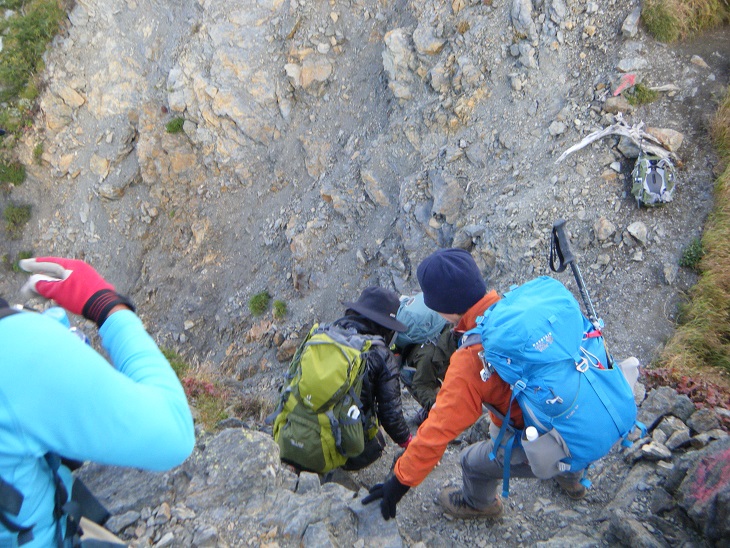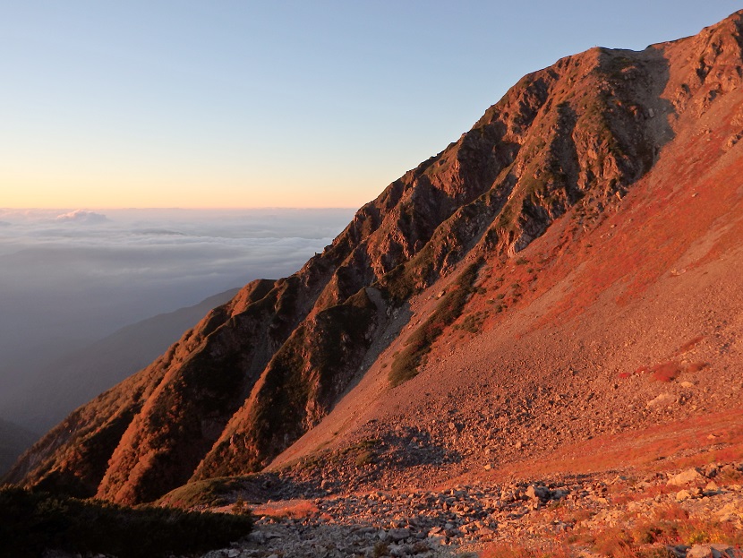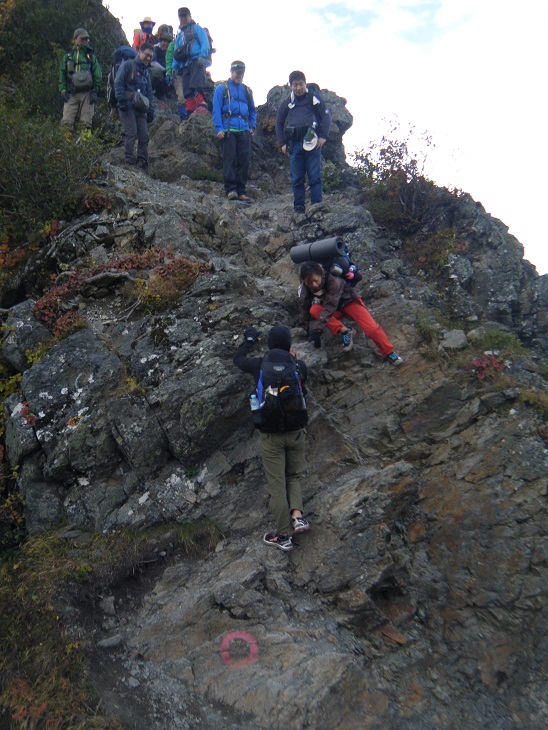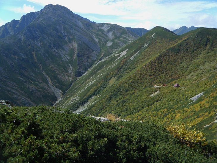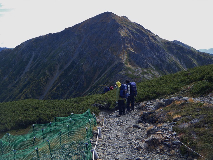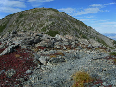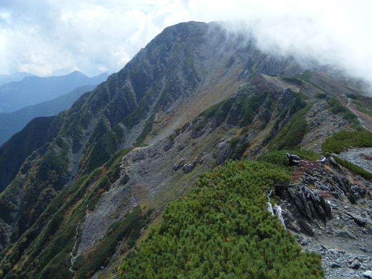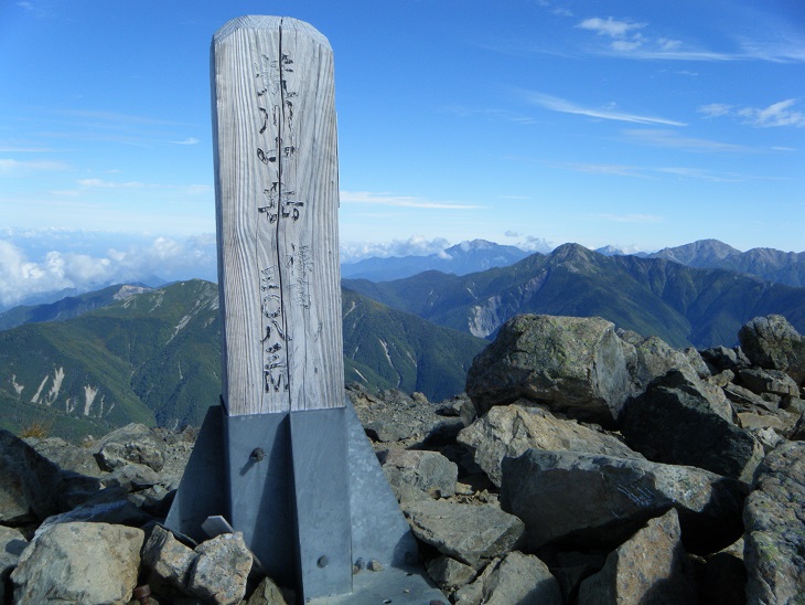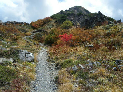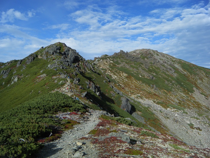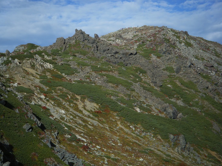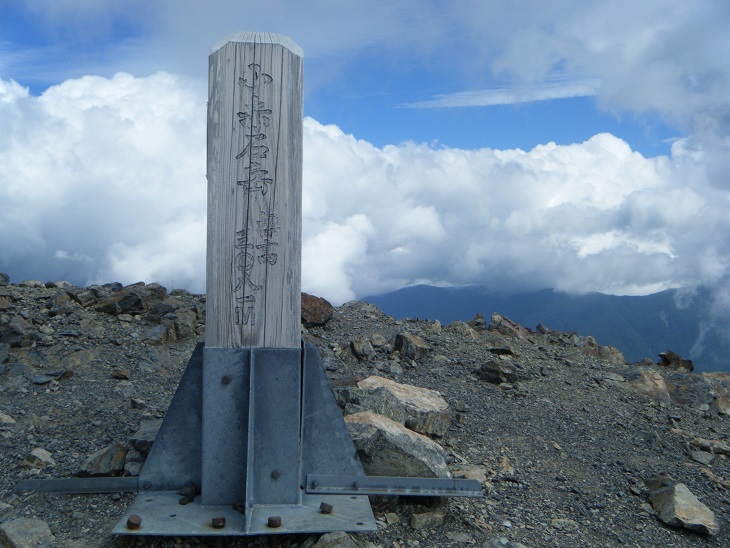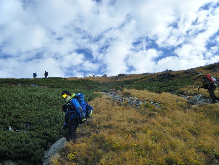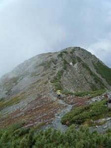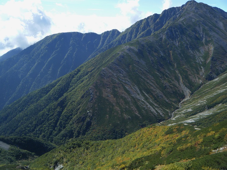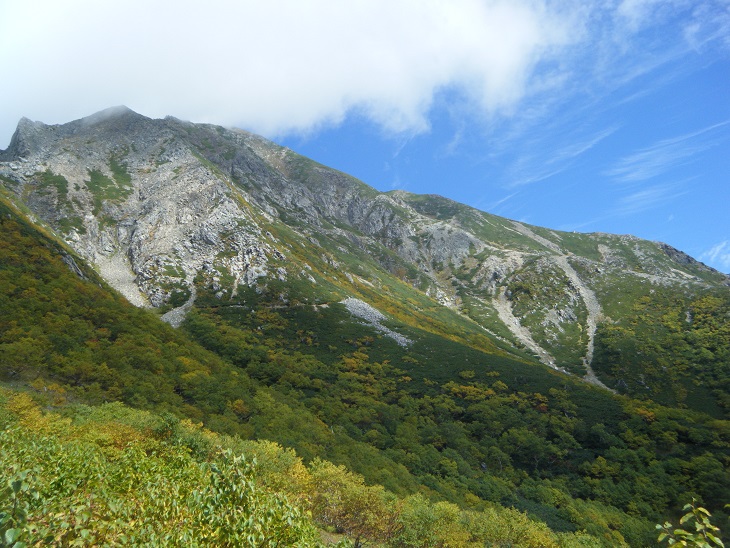 8時14分、今宵の宿泊地である千枚小屋に向け出発。今回の山行では不安材料が二つある。それは地図上に書かれている2か所の「危」マーク。千枚岳を越えたところにある「岩場のやせ尾根」と書かれたところと悪沢岳を越えたところにある「ガレた急坂」と書かれたところである。NHKの「にっぽん百名山」の悪沢岳の回も見たんだが「岩場のやせ尾根」の方はその手前の岩が非常に気になる。もともとは普通の登山道だったんだが崩壊が進み現在ではスパッと切れているのである。岩場嫌いの僕としてはそこが一番気がかりなのである。もう一つの方の「岩場のやせ尾根」の方はどうなっているのかわからん。まぁ「危」マークが付くくらいだから普通の道ではないのだろう。どちらも非常に気がかりだがそこをクリアしないと悪沢岳と赤石岳には登れない。嫌でもなんでも行かにゃならんのである。