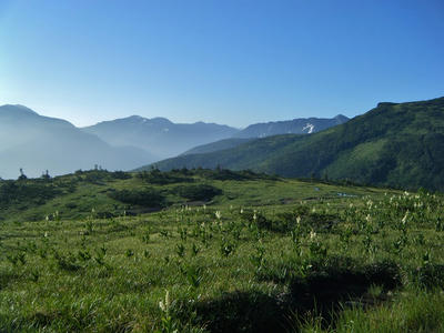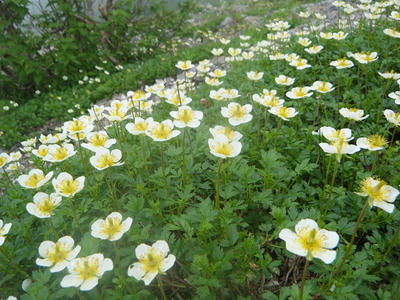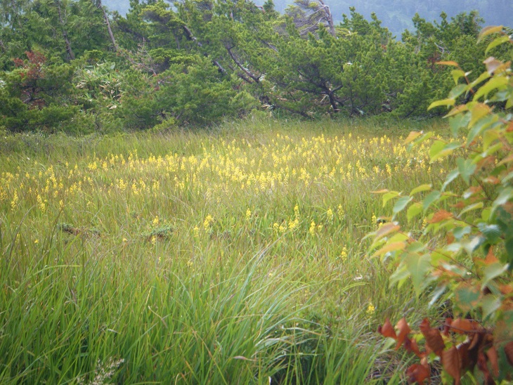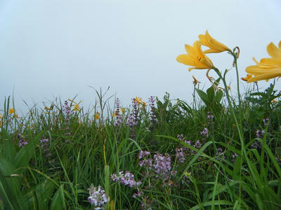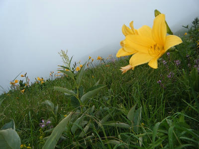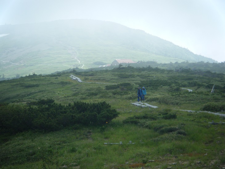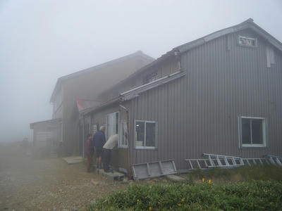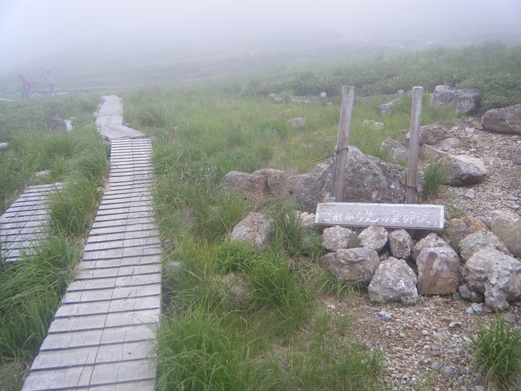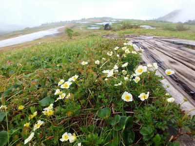 小屋の裏手、薬師沢へと続く道沿いにはお花畑。ガスの中でお花が咲き誇る。
